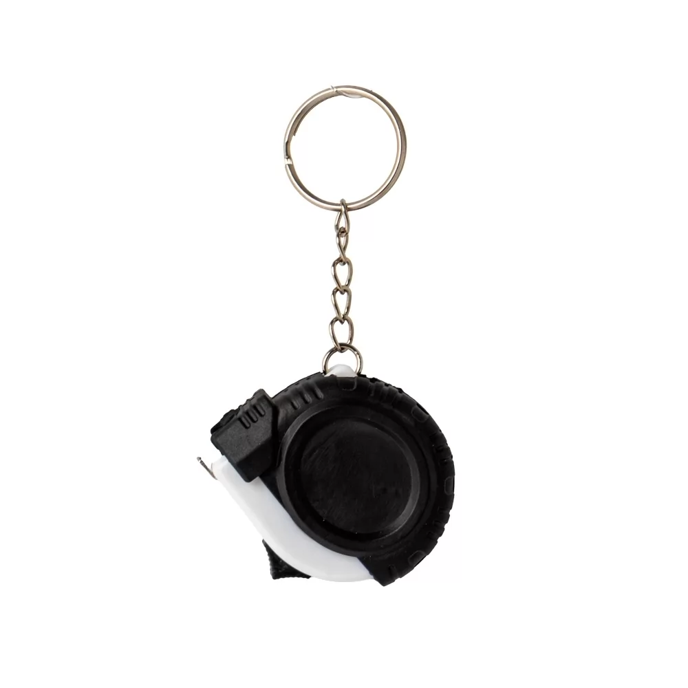 Chaveiro com Trena de 1 metro, aspecto de emborrachado com relevo em um dos lados e detalhe plástico branco. Possui trava e é mais um daqueles brindes 2 em 1.